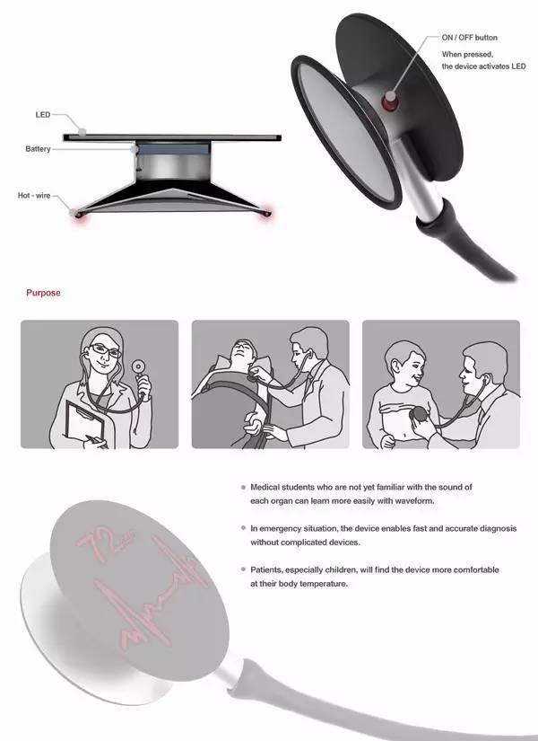 Optical Stethoscope是一款設(shè)計(jì)大膽并且富有科技感的概念光學(xué)聽診器,作為醫(yī)生的常用診斷工具如果能夠在設(shè)計(jì)上提高醫(yī)生的工作效率和數(shù)據(jù)的準(zhǔn)確性十分有必要。Optical Stethoscope在拾音部件上設(shè)計(jì)有顯示屏可以在聽診的時(shí)候?qū)崟r(shí)的顯示出相應(yīng)部位的波形圖已經(jīng)跳動采集次數(shù),可以說更加直觀準(zhǔn)確。